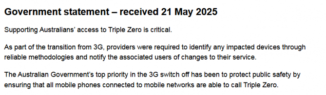 “澳大利亚政府在3G网络关闭过程中始终将保障公共安全置于首位,确保所有连接移动网络的手机均能拨打紧急服务电话。”